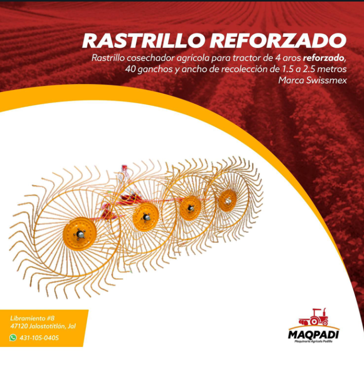 4 Aros, 40 ganchos, ancho de recolección 1.5 a 2.5m según el ángulo de ataque.