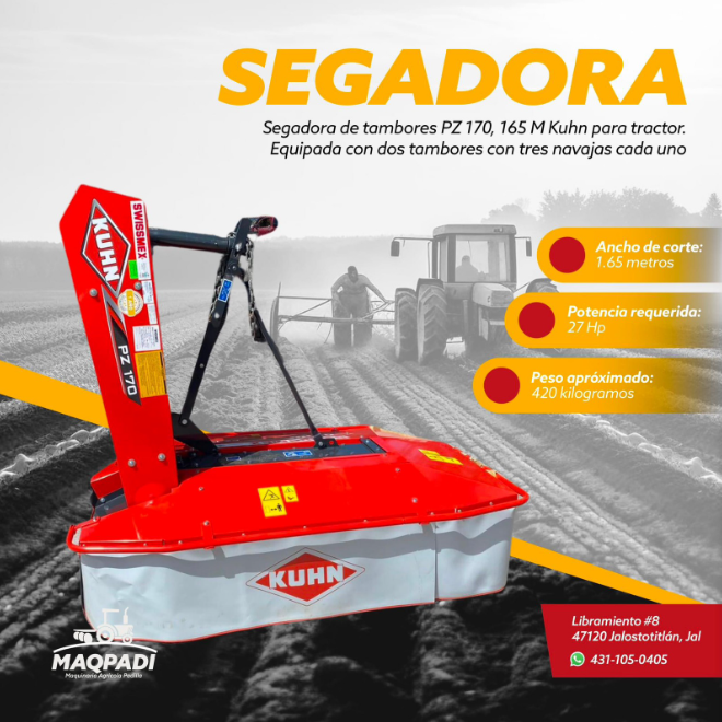Ancho de corte 1.65 m. 2 tambores con 3 navajas c/u Potencia mínima requerida 27 Hp. Peso aproximado 420 kg.
